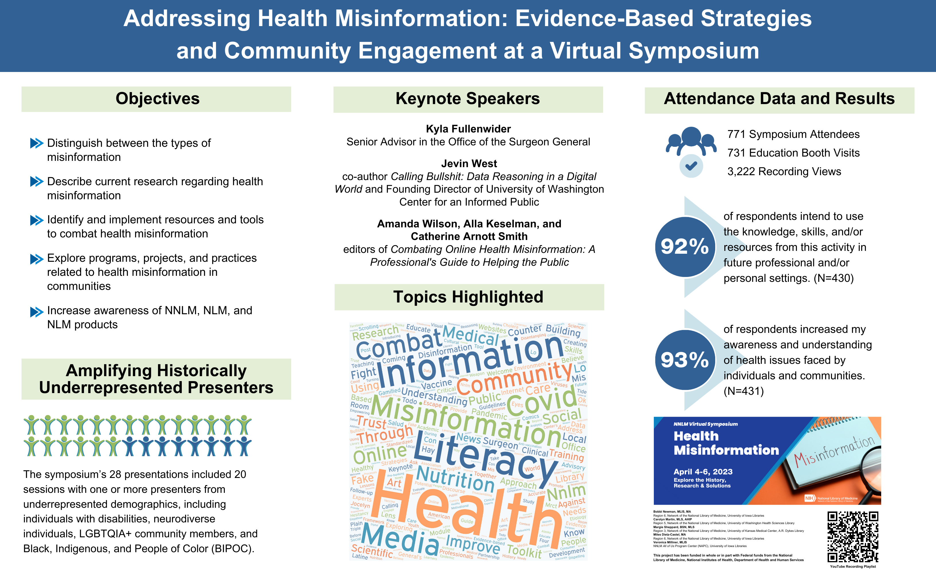 The first poster, “Addressing Health Misinformation: Evidence-Based Strategies and Community Engagement at a Virtual Symposium“, was a cross regional collaboration that highlighted the impact from the 2023 NNLM Virtual Health Misinformation Symposium. The second poster, “Value of State Advisory Groups (SAGs)“, showcased the culmination of the hard work put forth by Region 6 and countless partners in the creation of State Advisory Groups that developed state specific community tools and programs.