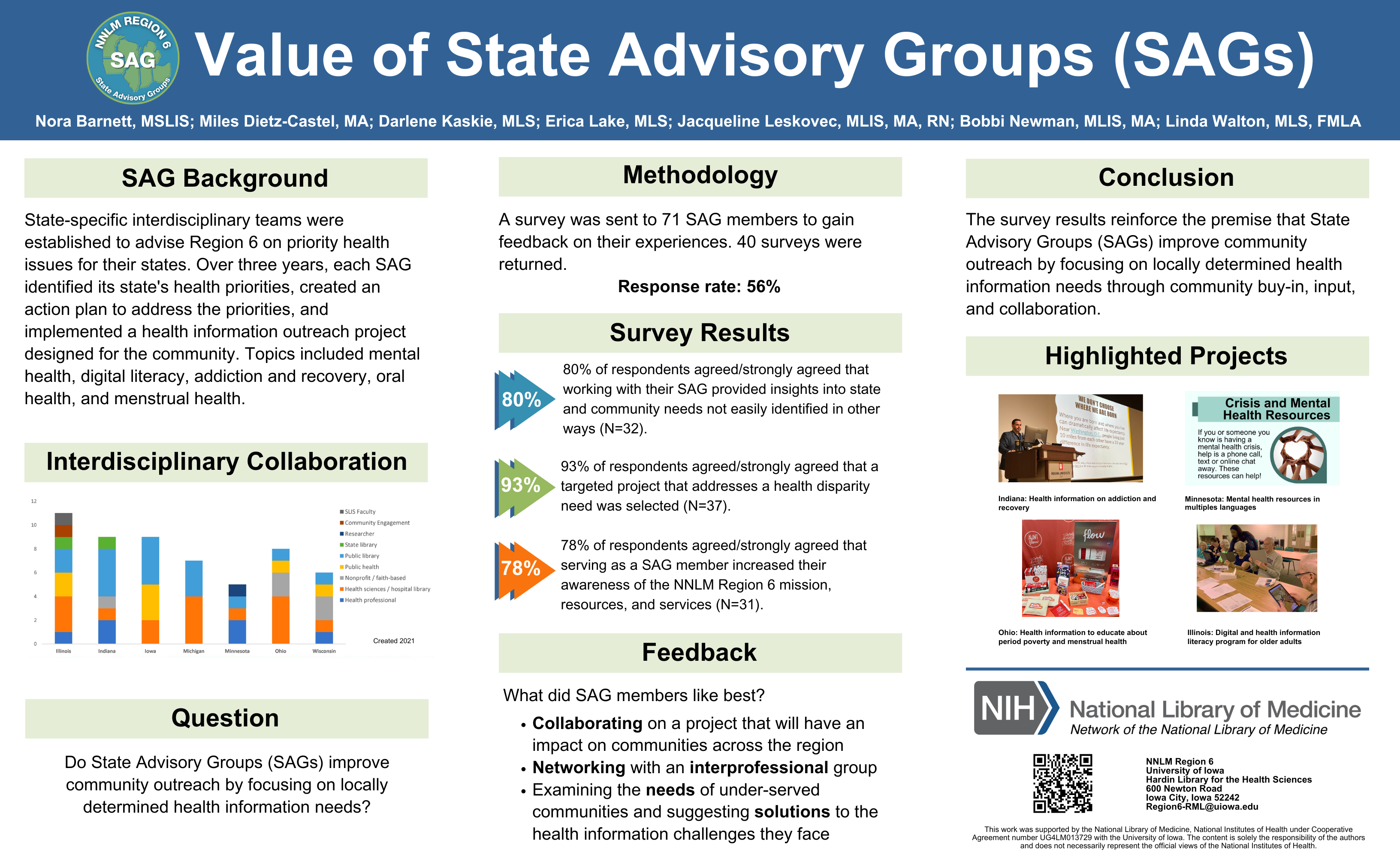 I have really enjoyed seeing the outcome of the State Advisory Groups. We engaged with people who are passionate about improving quality information resources for their communities and the resulting projects show that working together we can create quality resources for very little funding. I also want to thank the staff for all their hard work in making the advisory groups so successful. I know it is very labor-intensive working with so many different individuals and getting consensus on what is most important and what can be done to improve and support the identified topics.