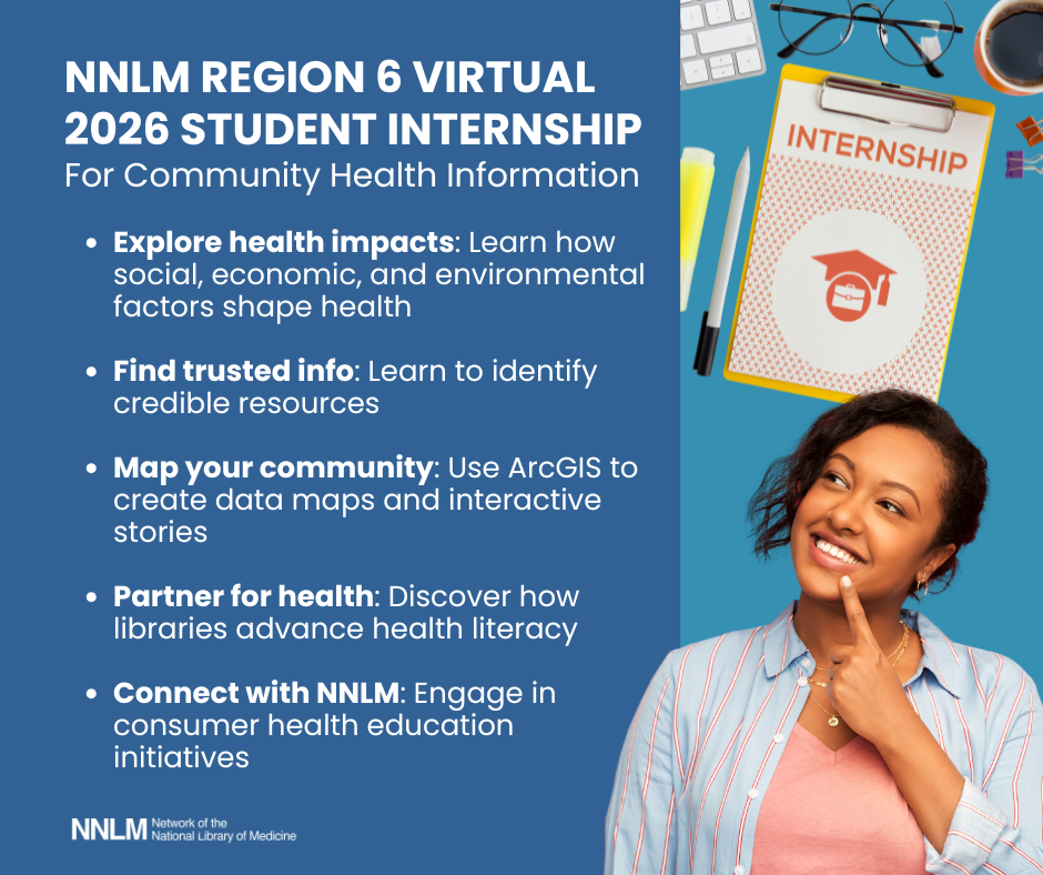 Are you a library and information science student interested in learning more about community health information outreach? Are you enrolled in a program in Illinois, Indiana, Iowa, Michigan, Minnesota, Ohio, or Wisconsin? Region 6 invites you to apply for our Spring 2026 virtual internship for Community Health Information, January 26 – April 6, 2026. This 12-week internship focuses on consumer health literacy, social determinants of health, health statistics resources, and mapping software. Students will use the knowledge and skills they acquire to develop content for the NNLM Community Guide to Advance Health Information.